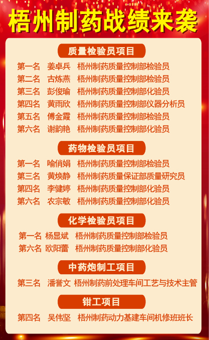 3金1銀3銅,梧州制藥45名職工在2024年梧州市職工職業(yè)技能大賽中秀絕活、展風(fēng)采、創(chuàng)佳績(jī)。在角逐中藥炮制工、質(zhì)量改進(jìn)員、藥物檢驗(yàn)員、化學(xué)檢驗(yàn)員、維修電工、焊工、鉗工等7個(gè)項(xiàng)目比賽中創(chuàng)下歷史最佳成績(jī)。