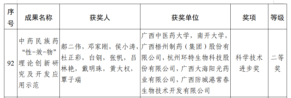 7月4日,2024年度廣西科學(xué)技術(shù)進(jìn)步獎(jiǎng)獲獎(jiǎng)名單正式公布,廣西梧州制藥(集團(tuán))股份有限公司參與的《中藥民族藥“性-效-物”理論創(chuàng)新研究及開(kāi)發(fā)應(yīng)用示范》項(xiàng)目榮獲廣西科學(xué)技術(shù)進(jìn)步獎(jiǎng)二等獎(jiǎng)。獲獎(jiǎng)項(xiàng)目由大學(xué)院校和企業(yè)聯(lián)合完成,旨在通過(guò)創(chuàng)新的理論研究,揭示中藥和民族藥的藥效物質(zhì)基礎(chǔ),提升傳統(tǒng)藥物的現(xiàn)代化水平,梧州制藥作為該項(xiàng)目的第三完成單位,彰顯了其在中藥現(xiàn)代化研究領(lǐng)域的實(shí)力。
