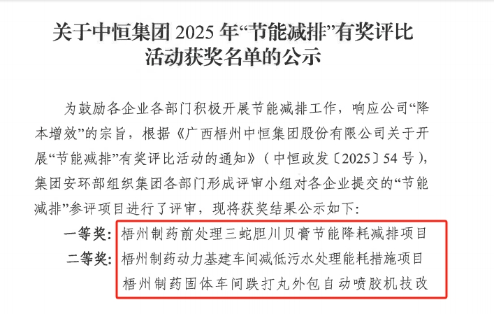 近日,在中恒集團(tuán)“節(jié)能減排”2025年有獎(jiǎng)評(píng)比活動(dòng)中,梧州制藥多項(xiàng)目脫穎而出,包攬一、二、三等獎(jiǎng)。其中,前處理車間三蛇膽川貝膏節(jié)能降耗減排項(xiàng)目獲一等獎(jiǎng);動(dòng)力基建車間減低污水處理能耗措施項(xiàng)目、固體車間跌打丸外包自動(dòng)噴膠機(jī)技改項(xiàng)目獲二等獎(jiǎng);原料藥車間熒光素鈉生產(chǎn)線反應(yīng)室通風(fēng)系統(tǒng)及地面整改項(xiàng)目、液體車間減排綜合項(xiàng)目獲三等獎(jiǎng)。
