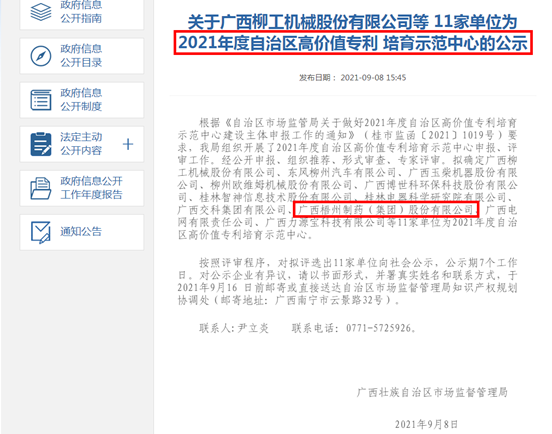近期,廣西壯族自治區(qū)市場監(jiān)督管理局發(fā)布關(guān)于2021年度自治區(qū)高價值專利培育示范中心的公示名單,梧州制藥被確定為2021年度自治區(qū)高價值專利培育示范中心。建設高價值專利培育示范中心,